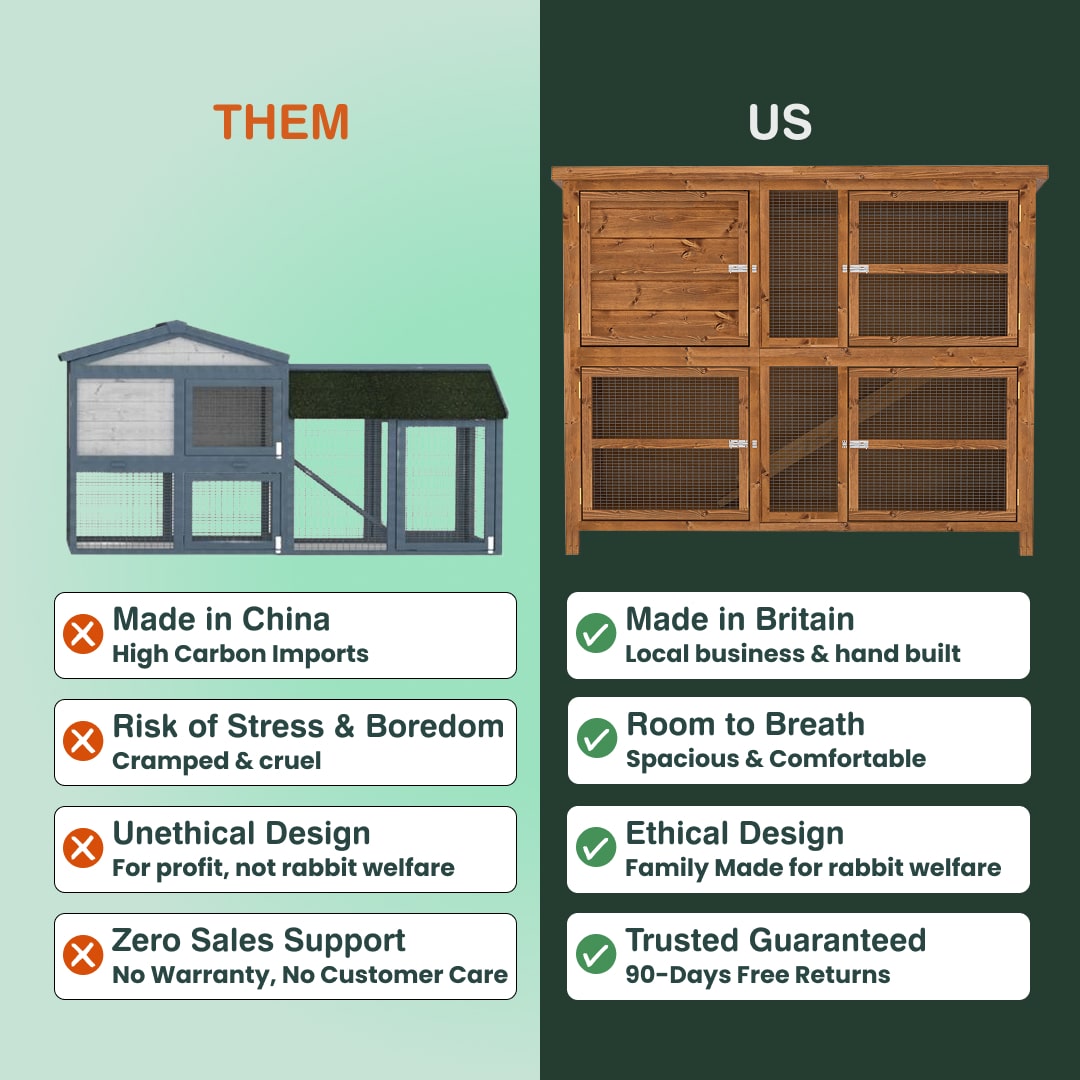 The hutch is built with 10mm thick Forest Stewardship Council (FSC) timber panels, making it extremely sturdy and durable. It’s designed to withstand different weather conditions, providing a safe and secure home for your pets year-round. Because we hand make all our own products if you ever need a spare part your covered under 5 year guarantee.